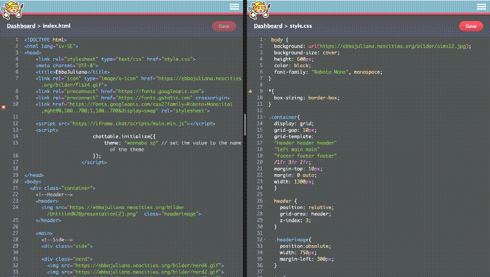 Här är de första raderna av kod för den här hemsidan! HTML till vänster, CSS till höger. Man ser typ baraikonbilden, titeln, JS för (trasig) chatt och alla nörd-gifs.